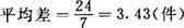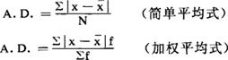 各单位标志值与平均数的离差绝对值的算术平均数。 各标志值与平均数的离差越大,则各标志值的变动度越大;离差越小,则各标志值的变动度越小,所以,平均差能综合反映总体中各单位标志值的变动程度。计算平均差的步骤为:(1)计算数列中的算术平均数;(2)计算各单位标志值和算术平均数的离差绝对值;(3)用这些离差绝对值的总和除以总体单位数,算出平均差。计算公式如下:  式中:A.D.代表平均差, 代表平均数,f代表次数,x代表标志值,N代表总体单位数,∑表示总和符号。 例如,某生产班组日产零件资料如下表:   |
