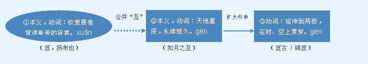 字源解说 “亘”是“宣”* 的本字;“亙” 是“恒”的本字,在《汉字简化方案》之前,由于“亘”的楷书字形 与“亙”的楷书字形 相似,“亘”合并了“亙”,以致“亘”的含义复杂化。本 字“亘” “亘”是“宣”的本字。亘,甲骨文 、 在收卷的简册形状 、 中间或上方加一横指事符号 ,表示将简册展开,当众宣读由帝王钦题、由钦差宣读的“圣旨”。造字本义:钦差展开册子宣读帝王的旨意。篆文 将甲骨文 字形中的 写成 ,将字形中的“一” (天)写成“二” (天地)。隶书 则误将篆文字形中的册子形状 写成了“日” ,面目全非。楷书 承续隶书字形。后来“亘”合并了“亙”的含义,而“宣读”的本义却消失了;当“亘”的“宣读”本义消失后,甲骨文 在册子 上方加“宀”(宫殿)另造“宣”代替。注: “亘”合并“亙”之后,“亘”不读它原有读音 xuān ,而转读被 合并字“亙”的读音 gÈn ,这是合并过程发生的“变读”现象。 合并字“亙” “亙”是“恒”的本字。亙,甲骨文 = (二,代表天地两极)+ (夕,即“月”,借代天体星辰),表示天地、明月的永久自然景象。造字本义:天地宇宙,日月星辰,千古如斯,永续恒久。有的甲骨文 再加“弓” ,强调月亮总是趋于“弓”状。金文 承续甲骨文字形,将甲骨文中的 写成明确的“夕” (即 )。籀文 将金文的“夕” 写成 。有的籀文 又将 误写成了“舟” 。有的篆文 则在籀文字形 的基础上,加“心” ,表示感情、态度的稳定持久,同时加“木” ,表示“極端”,方向唯一。 籀文字形 隶化后印刷体楷书写成 ,将籀文字形中的“舟” 写成似“月”非“月”的 ,同时也将甲、金、籀、篆字形的“天地”指事符号 淡化。 当“亙”的“永恒”本义消失后,金文 加“心” 另造“恒”代替。“亙”被“亘”合并后,“亘”行“亙”废。 --new/01ri/11beijingse-biaogaotu30xiangsu.gif) 亘 文言版《説文解字》: 亘,求亘也。从二从囘。囘,古文回,象亘回形。上下,所求物也。 亘 白话版《说文解字》: 亘,追求永远不变。字形采用“二、囘”会义。“囘”,是古文的“回”字,象亘回的形状。上下两横,代表所求的所有东西。 亙 文言版《説文解字》: ,竟也。从木, 聲。 ,古文 。亙 白话版《说文解字》: 亙,终极。字形采用“木”作边旁,采用“ ”作声旁。 ,这是古文写法的“ ”字。 引申线索
