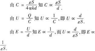 (2)平行板电容器充电后,若切断电源,则电容器极板上的电荷量Q不变,当电容器的结构d、S,ε发生变化时,将引起电容器的C,Q,E怎样变化? 这类问题可根据下列几式进行讨论:(只提供分析程序,结论不必记住)