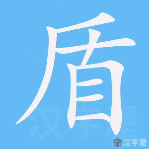 字源解说 盾,篆文 = (护身挡牌)+ (十,“又”的变形,表示持握)+ (目,眼睛,代头部),表示手持护牌,举在头上,重点保护头部。造字本义:古代士兵作战时使用的护身硬牌,可以抵御矛枪进攻;士兵一手持盾保护头部,一手持戈戟进攻。 附 文言版《説文解字》:盾,瞂也。所以扞身蔽目。象形。凡盾之屬皆从盾。 附 白话版《说文解字》:盾,盾牌。是用来挡护身体、蔽护头部的防护武器。字形像盾牌的形状。所有与盾相关的字,都采用“盾”作边旁。