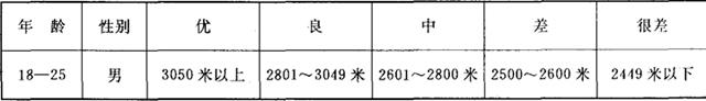 从第7周起,根据性别、年龄及12分钟跑测定结果选择适当的训练计划,按这种计划进行训练,属“劣”级的人也可能在满16周时达到“良”级水平。 达到良好水平后,健康状况可有较大改观。 库伯跑步法的第二阶段就是继续坚持第一阶段末期的训练内容,以保持获得的训练水平。 从事库伯跑步法时应注意下列各点:(1)锻炼前要进行体格检查,30岁以上者要包括心电图检查。 检查中有异常发现者须经医生同意方可参加煅炼。(2)50岁以上者一般应从练习步行开始,步行的速度要稍快,每分钟约走100米左右。(3)严格遵守循序渐进的原则,锻炼须从预备性训练开始,逐步进行,不宜超越计划,急于求成。 (附我国大学生12分钟跑评价标准)