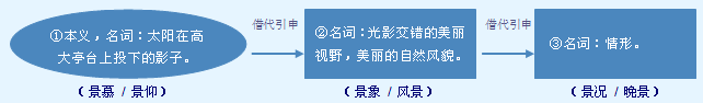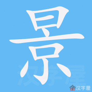 字源解说 京,既是声旁也是形旁,表示古代用以瞭望预警的高大亭台。景,古鈢字形 = (日,太阳)+ (亭,代表楼台建筑),表示日照楼台。造字本义:太阳在高大亭台上投下的影子。篆文 将古鈢字形中的 写成 。“景”的“影子”本义消失后,再加“彡”(光影)另造“影”代替。 附 文言版《説文解字》: 景,光也。从日京聲。 附 白话版《说文解字》: 景,太阳的光。字形采用“日”作边旁,“京”是声旁。 引申线索