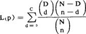 指抽样检验中,在不合格品率一定的条件下,从一批产品N件中发现的不合格品件数d,小于和等于可接收的合格判定数c的概率。 其计算方法如下: (1)当批量N不大(1000以下)时,可根据超几何分布原理按下式进行精确计算:  式中:L(p)表示接收概率;D表示批不合格品数,D=N·P; 表示从批的不合格数D中抽出d个不合格品的全部组合数; 表示从批的合格品数(N-D)中抽出(n-d)个合格品的全部组合数; 表示从批量为N的一批产品中抽取n个单位产品的全部组合数。 (2)当批量N较大(1000以上)或抽样比n/N小于10%时,可根据二项分布原理按下式作近似计算:  式中: 表示从大小为n的样本中含不合格品数为d的全部组合数。 (3)当合格判定数c较大时,可根据泊松分布原理按下式作近似计算:  式中:e表示自然对数的底,e=2.7183……。 |