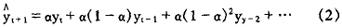 一次指数平滑预测模型是:  其中体现的预测思想是,一个新的预测值等于前期旧的预测值再加上一个前期预测误差调整项。(1)式中,α为平滑系数,yt为时间序列{yt}的第t期观察值, t是其预测值。把(1)式递推展开,就可以得到:  ,实际上是第t期的指数平滑值。(2)式右边的权系数是指数几何级数,指数平滑也由此得名。一次指数平滑法用于实际数据序列以随机变动为主、没有明显变动倾向的场合。其优点是: ❶ 对不同时间的数据的非等权处理较符合实际; ❷ 仅选定一个参数α即可预测,简便易行; ❸ 具有适应性,即预测模型能自动识别数据模式的变化而加以调整。 二次指数平滑法,就是对一次指数平滑值序列再作一次指数平滑,并在此基础上,仿照二次移动平均法,根据滞后偏差的演变规律来建立线性预测模型,适用有线性增长倾向的情形。 三次指数平滑法,是对二次指数平滑值序列再作一次指数平滑,并在此基础上建立非线性预测模型,适用于实际数据序列有非线性增长倾向的情形。 |