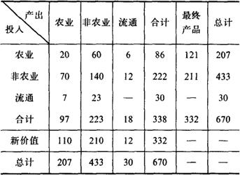 从表中可以看出,农业和非农业部门的物质消耗是按消费者价格计算的,其中包含了它们支付的流通费用,而表中“流通”一行的数字又是农业和非农业部门支付的流通费用,因此按消费价格编制投入产出表会造成流通费用的重复计算 |