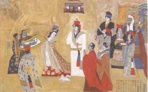 文成公主(约623~680年),吐蕃名甲木萨汉公主,唐太宗李世民宗室女。 她是唐代吐蕃松赞干布的第二位皇后(第一位皇后来自今日的尼泊尔)。 松赞干布是藏族历史上的英雄。 他统一藏区,成为藏族的赞普(“君长”之意),建立了吐蕃王朝。唐贞观十四年(640年),他遣大相禄东赞至长安,献金5000两,珍玩数百,向唐朝请婚。 太宗许嫁宗女文成公主。 文成公主在吐蕃生活了近40年,一直备受尊崇,对吐蕃供献良多。她曾设计和协助建造大昭寺和小昭寺。在她的影响下,汉族的碾磨、纺织、陶器、造纸、酿酒等工艺陆续传到吐蕃;她带来的诗文、农书、佛经、史书、医典、历法等典籍,促进了吐蕃经济、文化的发展,加强了汉藏人民的友好关系。 她带来的金质释迦牟尼佛像,至今仍为藏族人民所崇拜。  文成公主入藏图 |