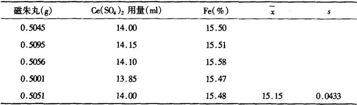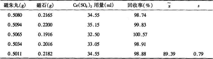 加样回收试验:将0.5g的磁朱丸粉末与0.2g的自制磁石标准品混合,参照改进测定方法,测其中Fe的总含量,然后计算回收率。 表13-16-2 回收率结果(n=5)