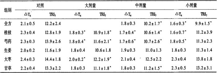 注:△T4:药后4h动物体温比基础体温的升高值(℃),TRI7:药后7h同体温——时间曲线下面积;与对照组比较*P<0.05(下同) 1-16-3 桂枝汤及其各组成药味对安痛定致低温大鼠体温的影响(x±s)