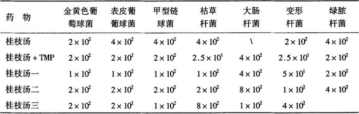 注:“\”号表示无抑菌作用。 实验结果表明桂枝汤先伍后煎与先煎后伍的抑菌效果完全相同。 TMP与桂枝汤合用,对变形杆菌、枯草杆菌的抑菌作用明显增强,分别提高了4倍和8倍;对表皮葡萄球菌、链球菌、绿脓杆菌和大肠杆菌的抑菌作用亦有所增强,提高了1倍;而对金黄色葡萄球菌抑菌作用反而减弱。 分别将桂枝汤中甘草量提高1倍(桂枝汤一),桂枝和白芍量各减少一半(分别为桂枝汤二和桂枝汤三)来研究比例改变对其抑菌作用的影响。结果其抑菌作用均得到不同程度的提高,其中以增加甘草量的效果最佳,而分别减少桂枝和白芍的结果基本一致,见表1-16-5。 表1-16-5 桂枝汤配伍改变后的最低抑菌浓度MIC(g/L)