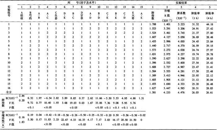 3.抗病毒作用 桂枝汤的正交设计法的组方分析[5] 正交设计:桂枝汤由5味药组成,药材均经鉴定,选用正交表L16(215),每味药为一个因子,随机分别置入1、2、5、8、14各列。每一因子取二个水平,“1”水平不给药,“2”水平给药。按表进行16组实验33]。各组的给药剂量,以各该药味在全方17.5g生药/kg总剂量(按体表面积换算,相当于成人临床用量)中的所占比例,相应称取,配合共煎浓缩到相同体积,冰箱保存,作灌胃用。为了能与整方的作用相比较,同时另设一全方组。 瑞士种封闭群小鼠,雄性,体重14~16g或18~22g,随机分组,每组10只。 实验指标:流感病毒性肺实变(肺指数);感染动物血浆炭粒清除率(K值);感染动物的脾重(系数);角叉菜胶性足肿张(肿胀率)。实验方法均按实验室常规。前三项,先以15LD50的流感病毒亚洲甲型鼠肺适应标FM1滴鼻感染,感染后当日开始给药,连续4d后进行测定或剖验。第4项,于小鼠左右足跖皮下注入角叉菜胶前1h,灌胃给药一次,致炎后1~6h分别测足跖容积,计算肿胀率。 直观分析和方差分析:各实验组测得的平均值列于表1-16-6右侧的四个纵列。表1-16-6下端的R值为极差,即(K2-K2)/8,K1、K2分别代表“1”水平和“2”水平对应的实验所得数据的总和,R值的正负和大小,反映了药味效应的差别和强弱。如肺指数为正值,说明药物能抑制流感病毒性肺炎,值越大,抑制作用越强;吞噬活性K为正值,说明对RES吞噬功能有抑制作用;脾系数为正值,说明可使脾脏重量降低;肿胀率为正值,说明有抗炎作用。如果为负值,则作用相反。 表1-16-6 正交设计及效应计算表