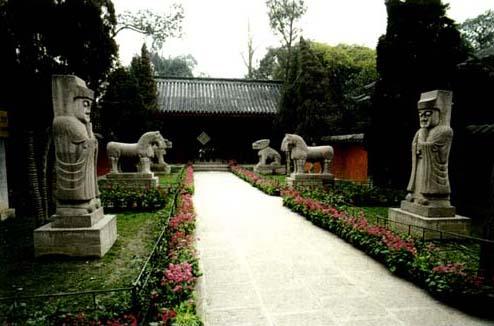 | 释义 | 武侯祠 诸葛亮(181年—234年)字孔明今山东沂南人是我国历史上卓越的政治家,军事家。三国时他任蜀国丞相,死后不少地方建有武侯祠祭祀他如陕西勉具武侯祠成都武侯祠。 成都武侯祠位于成都城南郊。丞相祠堂何处寻,锦官城外柏森森。”武侯祠为纪念三国蜀汉丞相诸葛亮而建。武侯祠最初与祀刘备的汉昭烈庙相邻并列。清康熙时(1672年)在昭烈殿后重建诸葛亮殿基本上形成了今天武侯祠前昭烈,后武侯这样的格局。武侯祠内青瓦红墙,殿宇宏伟,古柏葱郁恬静幽逸。1961年被列为全国重点文物保护单位。 走进武侯祠大门,古柏中矗立有数通石碑,其中著名三绝碑即蜀丞相诸葛武侯祠堂碑,立于武侯祠大门内东侧碑廊。唐元和四年(809)建由唐朝著名宰相裴度撰文著名书法家柳公绰(柳公权之兄)书写,名匠鲁建勒石上碑因文章书法、镌刻都出自名家,被后世称为三绝碑。 二门内是刘备殿。刘备殿正中供奉首3米高的蜀汉皇帝刘备的贴金泥塑坐像东西偏殿供奉著大将关羽、张飞等人,殿侧两廊各有文臣武将的彩绘泥塑坐像,阵容齐整,造型生动。自刘备殿经过厅至诸葛亮殿,殿内供祀著诸葛亮、诸葛瞻、诸葛尚祖孙三人的贴金泥塑坐像,以褒诸葛三代人的忠贞。 武侯祠内不见刘备之子刘禅的塑像。传说最初建汉昭烈庙时有刘禅的塑像置于刘备像侧。庙成之后一个夜晚,刘备显灵质问刘禅为何将江山失掉。刘禅答江山有何作用,有之十分辛苦,无它却轻松。刘备大怒,命武将将其逐出。从此汉昭烈庙内再无刘禅的塑像。代之以刘备其孙刘湛像。刘湛封北地王,当闻知魏军已兵临成都城下,其父刘禅准备开门请降时,刘湛先杀死自己的妻儿,然后至刘备的照烈庙恸哭自刎而亡。东西偏殿有关羽、张飞等人的塑像。殿前东西两廊分别为文臣武将廊,共塑28位,东廊文以庞统、西廊武以赵云为首。 刘备殿西侧的惠陵,向来传说为刘备与甘、吴夫人的合葬墓。但时至今日,怀疑此墓是否是刘备真墓者仍大有有在。刘备死在白帝城时正值初夏,当地一般气温都在30℃以上,且空气较为潮湿。按当时的条件,是不可能将刘备遗体完好地运回成都下葬的。“墓在成都论”及“墓在白帝城论”者双方各执一词。刘备墓封土高12米,墓墙周长180米,墓前有清乾隆年间立的“汉昭烈皇帝之陵”石碑一通。 武侯祠南侧是1984年成立的成都武侯博物馆,内有三国历史展览和三国文物陈列,现为诸葛亮与三国文化的资料中心和研究中心。