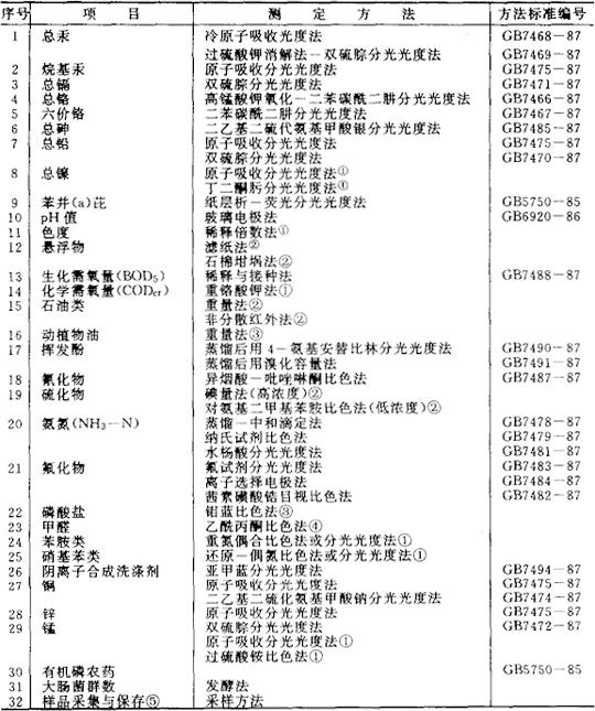 注 暂时采用下列方法,待国家方法标准发布后,执行国家标准: ❶ 水和废水标准检验法(第15版),中国建筑工业出版社,1985年。 ❷ 污染源统一监测分析方法(废水部分),技术标准出版社,1983年。 ❸ 环境监测分析方法,城乡建设环境保护部环境保护局,1983年。 ❹ 环境污染标准分析方法手册——工业废水分析方法,中国环境科学出版社,1987年。 ❺ ISO5667/1-3水质——采样的第一部分、第二部分、第三部分等。 |