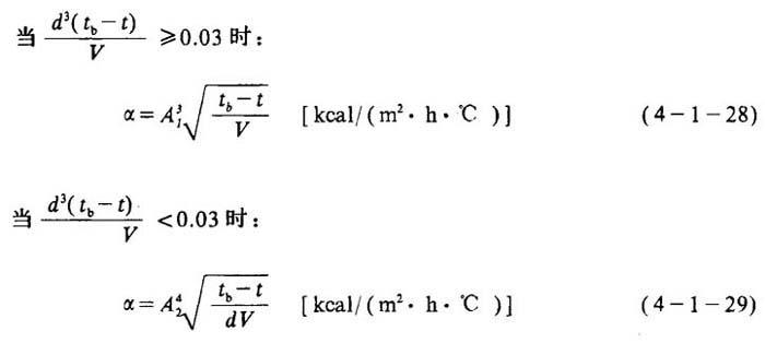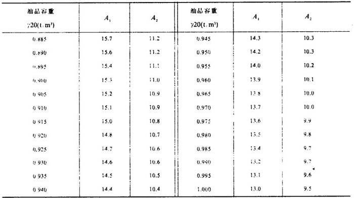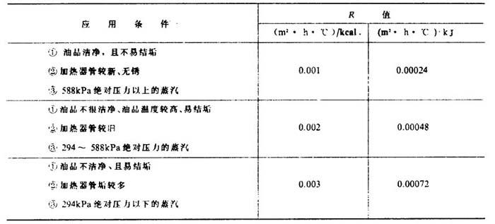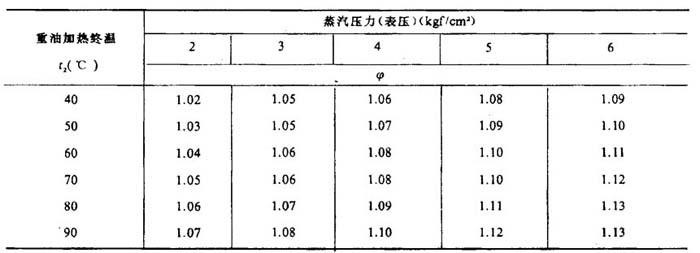 式中 F——加热面积(m2) Q——加热重油所需总热量(kJ/h) φ——蒸汽冷结水的过冷却系数,取决于重油的加热终温t2,用表4-1-5查取 t、——蒸汽饱和温度(℃) t——油品的平均温度(℃),同式4-1-23 K0——加热器内蒸汽向油品的总传热系数[kJ/(m2·h·℃)],可取经验数值ka=209.34~293.08;也可计算:  R——影响传热效果的补充热阻[(m2·h·℃)/kJ]一般取R=0.002,见表4-1-6 a——从加热器外壁到油品的给热系数[kJ/(m2·h·℃)] 表4-1-5 蒸汽冷凝水的过冷系数φ  注:1kgf/cm2=9.80665×104Pa 表4-1-6 补充热阻R   d——加热器管子外径(m) V——油品平均温度和蒸汽温度的算术平均值( 下的油品的平均粘度(托克斯S1)(1S,=10-4m2/s) A1、A2——系数,见表4-1-7 表4-1-7 系数A1、A2值  注:本表根据 A,-36 23Y20及A2-24.5 15Y20计算所得。 |
