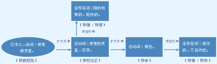 字源解说 乔,既是声旁也是形旁,表示迁移,改变。矫,篆文 = (矢,箭)+ (乔,迁移、改变),造字本义:使弯箭变直。 附 文言版《説文解字》:矯,揉箭箝也。从矢喬聲。 附 白话版《说文解字》:矫,揉压弯曲的箭杆,使之恢复平直。字形采用“矢”作边旁,“乔”作声旁。 引申线索