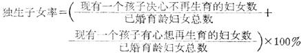 它概略地反映独生子女家庭的普遍程度。独生子女家庭包括两部分:一部分家庭女方已超过育龄期,丧失了再生育条件;另一部分尚处于育龄期。独生子女率正好描述后一部分独生子女家庭的普遍程度。由于现有一个孩子育龄妇女未必都终身不再生育,指标的分子包括著“决心不再生育”和“有心想再生育”的妇女两部分,因此,独生子女率的计算公式可改为: