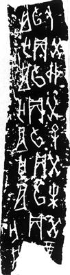 【赏析】: 武乙时代的卜文特点,是大字较多,书风粗疏古拙,劲削挺拔,气势凌厉,一扫前期頽靡之风。尤其是有的笔画起止处,已不同前期两头尖、中段略粗的笔致,而是起止处略呈方形,这明显是用双刀刻成,并在起笔收笔处,横切一刀的结果,这好似秦汉印章中冲刀、凿刀与切刀相结合所表现的线条一样。文丁时代,若干贞人的作品,表现劲峭,颇爲生动。运笔多用方笔,骨势开展,有运用方笔而兼有放逸的趣味。或细小秀丽,契刻劲利,自然生动。 |