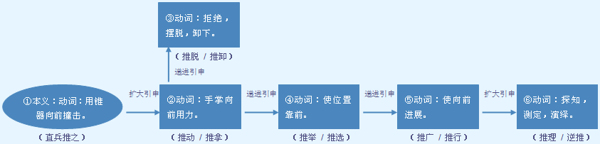 | 释义 | ![]() 用力使物体向外或向前移动: ~磨|顺水~舟|~波助澜|~着小车走过去|那扇门一~就开了。 拉 lā ~纤|生~硬拽|从水里把他~了上来|你去把那些货~过来。 ❶向外用力使物体或物体的某一部分顺着用力的方向移动。能重叠。 a.常作带宾、带补谓语。 他两手~着自行车|你~磨,我挑水|墙被~得裂了缝|请把车~到墙边|他~了我一下|这车不动了,你来帮我~~。 b.作定语,要带“的”。 他向我做了一个~的动作。 ❷使事情展开。常用于“把”字句。作谓语,常带补语。 把技术革新运动~向新高潮。 ❸推卸,推诿,推托。用于口语。常作带宾、带补谓语。 你不要~责任|他一口~得干干净净|你可不能~掉自己的责任|你往谁身上~呢? ❹推辞。用于口语。 a.作谓语,能带补语。 工厂要我当技术顾问,我~了|这个任务你~不掉。 b.作定语,要带“的”。 ~的借口是身体不适。 ❺推迟。能重叠。用于口语。 a.作谓语,可带补语。 开会的时间请再往后~一~|订货会已经往后~过两次了。 b.作定语,要带“的”。 ~的次数太多,会失去信誉|~的时间太长于工作不利。 ❻推选,推举。用于口语。作带宾、带补谓语,可构成兼语词组作谓语。 上级要我们推选一个负责人,我~老李|选班长的时候,大家把我~了出来|我被~为代表|大家~我当班长。 【近】 ❺延 ❻选 【反】 ❶拉 扯 【词语】 推本溯源 推波助澜 推陈出新 推诚相见 推迟 推宕 推倒 推导 推断 推广 推及 推己及人 推襟送抱 推究 推举 推理 推论 推拿 推求 推三阻四 推算 推推搡搡 推托 推诿 推想 推销 推谢 推卸 推心置腹 推许 推选 推延 推演 推移 推重 字源解说 隹,既是声旁也是形旁,“锥”的省略,表示利器。推,篆文 附 文言版《説文解字》:推,排也。从手,隹聲。 附 白话版《说文解字》:推,用手施力使物体滑动移开。字形采用“手”作边旁,采用“隹”作声旁。 引申线索 ![]() 【字族索引】 隹 【同音字】 tuī |