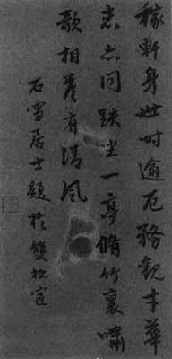 | 释义 | 稼轩身世诗轴 【简介】: 现代·徐宗浩书。纸本。行书。七言绝句一首。凡四行,共三十七字。刊于《民国时期书法》(中)。 【赏析】: 徐宗浩行书胎息赵孟頫,达到了酷肖地步。赵孟頫是集二王书法之大成者。他的行书婉约丰美,圆润妍丽,但也有人以爲圆滑柔媚,法者必难避其习气。实际上,关键在于学书者如何效法,再高妙的佳作因爲取法不得当而背道而驰者比比皆是。他们所强化的是法书中可能出现的弱点,因爲十全十美的书作是不存在的,学书方法也有高下之分。徐宗浩是学赵高手,他线条的起承转合做得十分纯熟,毫无凝滞之感。但也没有媚态,显得神采奕奕,还带有一点涩味,不使线条失控滑落。例如在许多萦绕而形成的圆圈之中,粗细迭代,交代得一丝不苟却不流于习气。他的起笔尖削处过于赵书,但这并没有给人带来尖利刻薄的感觉,还爲作品增添了纤劲。他要比赵孟頫更爲秀逸灵巧,还微微带点文徵明的斜势,令人赏之如在春花丛中穿行,十分甜美。可惜的是赵书的影子太浓厚了,赵书的韵味太醇酣了,而属于徐宗浩的东西却如游丝般难以寻觅,继承的十足和创新的不足,终于使他名在赵孟頫之下。