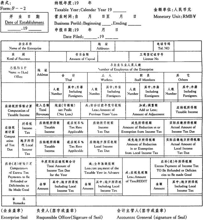 | 释义 | 纳税申报文书 【简介】: 纳税申报文书是按照国家税收制度的有关制度的规定,履行纳税义务的首要文件。它是纳税人履行纳税义务时使用的文书。纳税人在履行纳税义务前必须按规定向税务机关申报,办理有关手续作为基层税务机关核定应征税额和增开纳税凭证的主要依据。 根据《中华人民共和国税收征收管理暂行条例》规定,纳税人应当按照税务机关核定的纳税期限,填报《纳税申报表》,进行纳税申报,然后按照《纳税申报表》的要求,如实填写纳税事项、计算应纳税款。 各类纳税申报文书的现行标准样式附后,填制要求: 1.纳税申报文书一般分项申报。 2.纳税申报文书由四部分组成: (1)标题 标题包括税种和文种两部分。 (2)表首 包括:企业名称,工商企业应写税务登记证上的全称;税款所属日期;纳税项目;核定期限。 (3)正表 由三大栏构成:项目、企业申报数、税务机关审核。 (4)签署 包括五项内容:申报单位印鉴;财务负责人签署;经办人签署;税务专员签署;税务专管员签署。 【范例】: 工商企业纳税鉴定申报表 纳税单位名称:_____ 经济性质:____ 主管部门:____ 联系人:_____ 电话:_____ 填报日期:______ __市税务局印制 填表说明: 1.此表可参照企业产品销售或经营收入明细帐填列,填写要准确清楚。 2.经营方式: 工业企业(包括商办工业)销售给商业零售单位、个体商贩或使用单位和消费者的,都要注明;商业企业批发、零售及代理购销,前店后场,农产品采购要注明。 3.填表范围: 凡在本市范围内依法缴纳产品税、增值税及营业税的单位均应向主管税务机关领取并填报此表。 4.本表一式三份,盖章后报主管税务机关2份,1份留企业。 5.纳税核定申报项目栏不够填写时可另附说明。 纳税核定申报项目 People’s Republic of China Ministry of Finance General Taxation Bureau 外国企业年度所得税申报表 The Foreign Enterprise Annual Income Tax Return