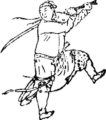明程宗猷《耕余剩技》“单刀说”篇载:“如先立外看势。彼枪从右扎入,我将刀往右推开枪,进左脚,偷右步左转身横靠一刀。