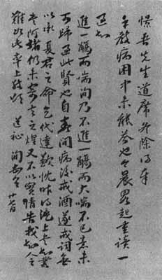 | 释义 | 致憬吾先生信札 【简介】: 近代·陈洵书。纸本。行书。凡八行,共一百一十四字。刊于《民国时期书法》(中)。 【赏析】: 此爲作者信札。前人谓欣赏书法,看碑刻不如看墨迹,看墨迹以信札与文稿最见眞本领。而文稿爲最眞,信札则在其次。因信札在写时欲爲人阅读,故不及文稿之自然流露。作者此书写时并非专意于书法创作,故较自然。可以看出,作者早年以颜书奠基,又旁涉诸家。故其行书亦以颜书风神爲主。