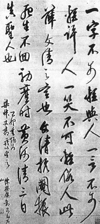 【简介】: 明·陈继儒书。纸本。凡五行。共七十字。112.5×51.6cm。上海博物馆所藏。刊于《中国明淸书法名品图册》。