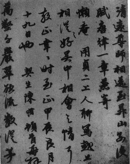 【简介】: 明·陈脩书。纸本。行书。凡十二行。每行字数不一。共一百一十九字。31×48.3cm。书七言律诗一首。台北故宫博物院藏。刊于台湾《故宫历代法书全集》(十四)。 【赏析】: 陈脩生当元季,其书法也自受到笼罩一代风气的赵字之影响,然欲变赵字之柔美,加入了刚健的因素。 此帖在行书特有的流美之中不乏劲气,笔笔挺拔,槪以硬毫所书。然点画偏细,出锋太多,不如赵字的圆润丰满。苏东坡曾讥时人书曰:“世俗笔苦骄,衆中强嵬峨。”陈脩此书也难免有过分骄跋的弊病。 此帖的正文是一首七律,前半部分是小序,小序的字较放松,随意出之,字体的结构大小没有正文那样著意。正文的字则基本大小一致,用笔与结体都较讲究,可见内容对书法的影响也不容忽视。