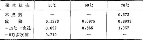 | 释义 | 菜丝的比热、堆积容重和渗出系数 (1)菜丝比热 0.87大卡/公斤·℃ (2)菜丝堆积容重 350~400公斤/米3 (3)菜丝细胞中水和蔗糖的渗出系数 水的渗出系数 0.35×10-5厘米2/秒 蔗糖渗出系数 (×10-5厘米2/秒) 表2-29 蔗糖渗出系数