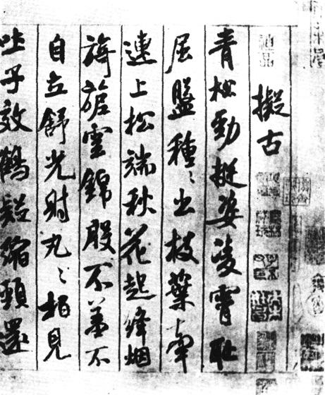 【集评】: 明顾从义跋:“余素爱米书,见者不下廿余卷。此卷五百五十六字,诗体具备,墨妙入神,眞秘玩也。”明董其昌跋:“朱元章此卷如狮子提象,以全力赴之,当爲生平合作。”淸吴其贞《书画记》:“书法淸健,结构潇洒,落笔处绝无垂珠滴露,盖用悬针,全脱本色,似仿李北海,稍类山阴图题跋之后段。”崇彝《选学斋书画寓目续记》:“蜀素者,宋时川中织之绫。其质作斜纹,坚白缜密。乌丝直栏亦织就者。……字径六分许,后半略小而荒率饶有逸趣。多作渴笔,盖由于绫不融墨使然也。” 【赏析】: 在传世的米帖中,这是唯一用丝织物爲载体而又有爲丝栏的作品,以字数而言,也当以此爲首了。三十八岁时的米芾,虽有顚名,却无功名。从早年因祖荫而得的浛光尉、长沙从事等微官去任后,他一直过著浪迹江湖、寄人篱下的“旅食”生活。从《拟古》的以靑松自况高洁期许到篇末的英才并肩取捨殊途的故作旷达,使人感觉到一股愤怒的激流在字裏行音奔注冲突。当然,在诗篇的开头尙有庄矜之态,其中也不无优游江湖的閑适,但随著诗中牢骚的增多,一种身世之感的悲壮便成爲结尾的最强音了。 米芾自叙“旣老始自成家,人见之不知以何爲祖”,我认爲《蜀素帖》便可看作是这一浑成境界的最好观照。在此,他已经完成了从“集古字”到自名一家的飞跃。以前的笔墨,由于受到“故作”的掣肘,时时显出不够自由的斧痕,而在这长篇巨制中已如天马脱衔,无往不利,轮扁运斤,有惊无险了。此帖的超妙尤见于结字,往往是匠心独运而不露痕迹。举开始数行爲例,“靑”字三横旣有一二的粗细之别,藏露之分,又有二三的俯仰之异;“种”字左右两撇皆处上端,即改变趋向以破除平行;“枝”两横相并,便以一露锋一藏头以取变化。凡此种种,不一而足。 米芾提出过“故作异”和“自然异”的著名理论。这个理论的科学性,可用今天从必然王国进入自由王国的学说来认同。我认爲此即米芾超越时代的秘诀。 |