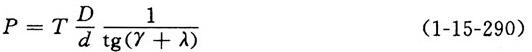 【说明】 螺杆加压是利用螺旋这一简单机械,以求以较小的力量得到最大的挤压力。然而在生产中用螺杆直接加压的情况是较少的,一般都要求有一个缓冲的余地,故多采用螺杆和弹簧相结合的加压装置,即使在施压过程中遇到一些过大的物料,也可藉弹簧的伸缩而安全越过,不致对设备产生任何损坏。螺旋加压常用于打包机械,纸机压榨部较少采用。参考图1-15-34。 1-手轮 2-螺杆 3-压板 4-打包机底板 【公式】  式中 P——螺旋加压的力(N) T——旋转手轮的力(N) D——手轮的直径(m) d——螺旋的直径(m) γ——螺杆与螺母间的摩擦角(度) λ——螺旋的升角(度) |