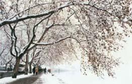 断桥残雪 断桥位于白堤东端,一说起自平湖秋月的白堤至此而断,故称断桥,又说元代桥畔住著一对以酿酒为生的段姓夫妇,故又称为段家桥。 断桥的出名与《白蛇传》有关,白娘子和许仙缠绵悲怆的爱情故事就是从断桥相会、借伞定情开始的。两人历经磨难再次在断桥相会时那生离死别的情景,又给每个游客以无尽追思。 断桥残雪是西湖冬季的一处独特景观。断桥背城面山,正处于外湖和北里湖的分水点上,视野开阔,是冬天观赏西湖雪景最佳处所。每当瑞雪初晴,桥的阳面已冰消雪化,“雪残桥断”,面桥的阴面却还是白雪皑皑,“断桥不断”。
