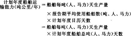 式中:计划年度船舶总吨(人、马力)天=∑〔船舶载货定额吨(人、马力)×计划年度船舶在册天数〕 〔参〕船舶每吨(人、马力)天生产量 报告期平均使用船舶数 |