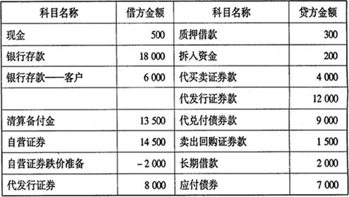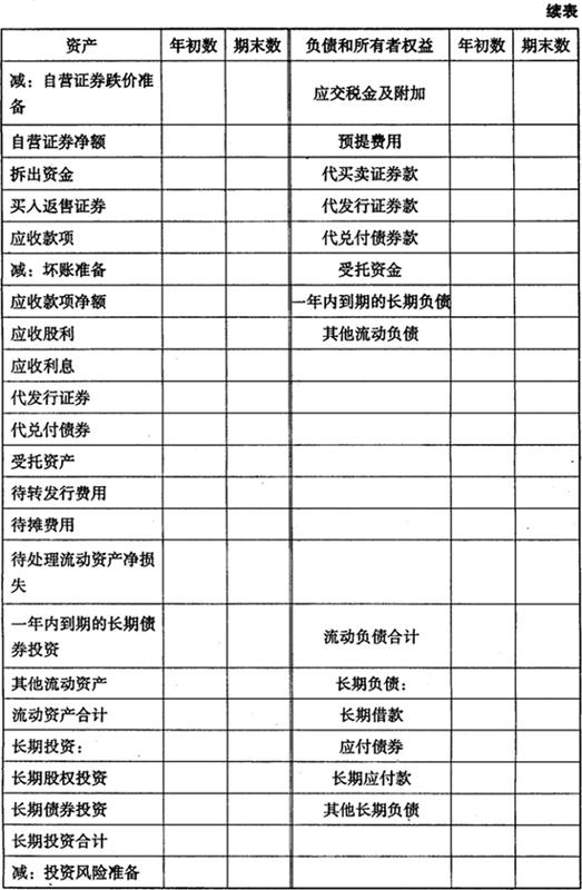 注:清算备付金中客户的清算备付金有6000000元。应付债券中有1000000 元在1年以内到期。盈余公积中包含公益金2000000元。 根据上述科目余额表和资料编制如下资产负债表(表3-4-15): 表3-4-15 资产负债表