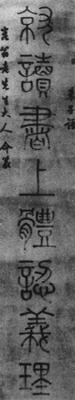 【赏析】: 我国文字是由象形发展而来的,小篆与大篆相比,线条更趋简化,形体也由放纵多变渐而趋于整齐匀整。董邦达的小篆,结体不像斯、冰之修长而略取横势,有的几于方正。但作者摈弃了唐以来小篆刻意引笔下悬,以求“悬针”、“垂露”之名,而代以方正匀称之结体。用笔皆以枯笔乾拉,但使转流畅不滞,匀圆遒劲,确乎“画如铁石,体若飞动”,笔势瘦劲俊逸,形态典雅宽舒。如“体”字,左边“骨”下“月”字与右边“豆”上“ ”,皆极灵致。若绝若连,近似小露缘丝,远像鸿鹄群游,络绎迂延。“豆”之略实托住上“ ”,“月”极虚仍苍劲而力不绝,一实一虚,一虚一实,体尽其妙。上字也极朴厚,结构上只二横一竪,无曲屈忸怩之态。笔简而字未简,反觉其于敦厚的用笔及结构中,显现出作者力追古人的精神。 通篇形态肃穆,笔致流畅,遒劲圆匀,敦厚雍容。书法达到这种精神境界,即使在有淸四百年的大书法家中也不多见。 |