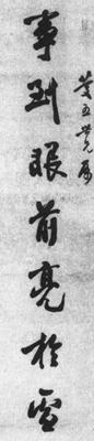 【赏析】: 此行书七言对联,天骨秀成,风神自在。笔意旷达高古,拙巧互用,温润中含挺秀之态。从此作品中能看出,书者能下笔有神,熟而不俗。从笔墨上来看,比较流畅自然,丝毫无矫揉做作之态。运笔筋骨血肉相辅,粗细、长短、曲直穷极变化,复归匀称。顿挫使转变化多姿,线条的使转流畅,如行似走,沉著痛快,娴熟自然。通篇笔意一气呵成。结构比较谨严,比例舒适,呼应巧妙,无雕饰之痕。字形大多呈长方形,体势因字而异,或抱合,或开拓,上下承继变化,左右虚实借让均很妥帖。再从整幅章法布局来看,上下联各七字,略呈欹侧,富有参差错落,呈现出齐而不齐之态。但气势雄强直贯,呈现出一种严谨而自然的艺术效果。 |