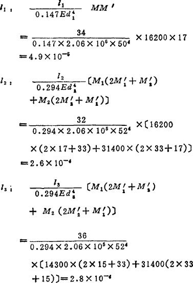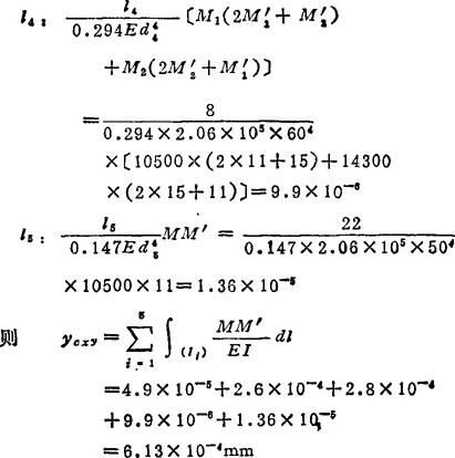 应该说明的是,这里是通过一种简单的受力情况以说明求挠度的一般方法,即分别在两个互相垂直的座标平面中求挠度,然后合成。实际上,就本例的具体情况而言,无需将齿轮所受的法向力分解。只需画出该力的弯矩图即可直接求yc。 |