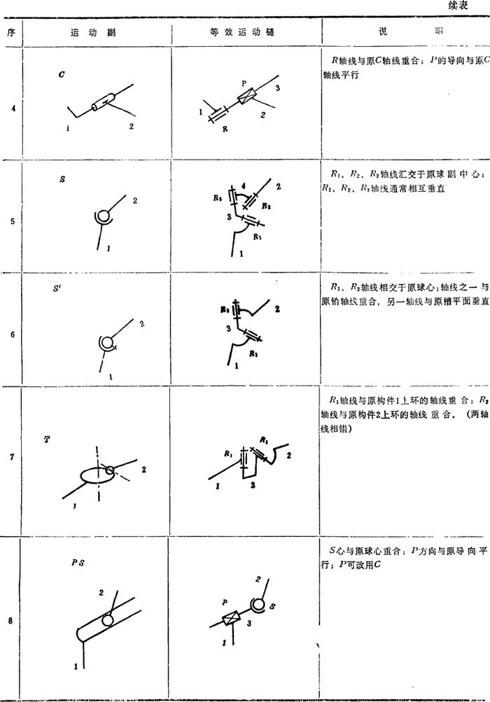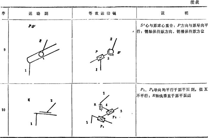 | 释义 | 运动副的替代 在机构的分析与设计中,有时可以用两构件间的运动链来替代某种运动副,而保持原有相对运动,在分析中进行替代,有时可以使问题简化;设计中的替代,有的是为了增大承载能力,有的是为了便于制造。几种运动副的等效运动链及其等效条件说明见表5.1-3。 表5.1-3 运动副的等效运动链