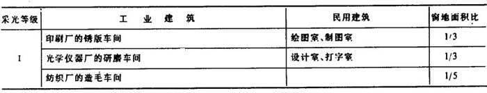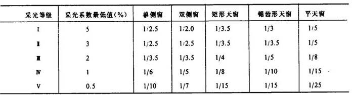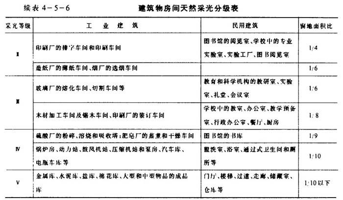 [说明]采光面积的确定,经常是根据厂房采光、通风和立面处理等综合要求,先大致确定窗面积,然后再根据厂房对采光的要求进行校核,验证是否符合采光标准。采光计算的方法很多,设计时可根据具体情况选用。另外,还有简易图表计算法(见《工业企业采光设计标准》),一般厂房窗户规整的,可采用此法。按现行规定,在初步设计中,只需用几何标准进行计算即可。 表4-5-5为窗地面积比的估算方法,这种方法是在大量调查研究的基础上制定的不同采光等级(见表4-5-6)与不同形式窗的窗地面积比。按此表,根据已知厂房的建筑面积,即可根据所选窗的形式计算出采光所需要的开窗面积。 表4-5-5 不同采光等级及窗形的窗地面积比  注:当Ⅰ级采光等级的车间采用单侧窗,或Ⅰ、Ⅱ级采光等级的车间采用矩形天窗时,其采光不足部分应用电气照明补充。 表4-5-6 建筑物房间天然采光分级表   注:此表只作初步设计参考用。具体应根据制浆造纸厂各车间的情况选定。 |