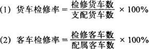 又称铁路车辆不良率或不良残车率。 指检修车数占全部现有车数的比重,是反映车辆状况的指标。应按客、货车分别进行计算。 对货车而言,它是全路或一个铁路局的检修货车数与支配(配属)货车数之比,对客车而言,它是检修客车数与配属客车数之比。其计算公式如下:  从公式可看出,车辆检修率愈高,表示检修车辆数的比重愈大,可以参加运用的车辆比重愈小;车辆检修率愈低,表示检修车辆数比重愈小,可以参加运用的车辆数比重愈大。 因此,车辆检修率愈低愈好。提高车辆质量,加强车辆的养护和保证修理质量,爱护车辆和精心运用是降低车辆检修率的重要途径。 |