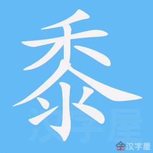 字源解说 黍,甲骨文 = (禾,穗子,谷物)+ (水,酒),表示一种可以酿酒的粮食。有的甲骨文 突出了禾穗下垂的样子,强调“黍”是一种成熟的谷物。金文 简化字形。篆文 = (禾)+ (冖,屋)+ (水,酒),强调将小米放在屋里酿酒。造字本义:小米,一种耐旱的庄稼,性粘,可酿酒。隶书 误将篆文字形中的“屋”形 写成 。 附 文言版《説文解字》:黍,禾屬而黏者也。以大暑而穜,故謂之黍。从禾,雨省聲。孔子曰:“黍可爲酒,禾入水也。”凡黍之屬皆从黍。附 白话版《説文解字》:黍,禾属而软黏的谷物之一。因为在大暑时节播种,所以称为谐音的“黍”。字形采用“禾”作边旁,用有所省略的“雨”作声旁。孔子说:“黍可酿酒,禾谷入水。”所有与黍相关的字,都采用“黍”作边旁。
