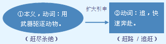 | 释义 | ![]() 动 驱逐。 【例句】~苍蝇。 【同义】撵;驱赶;驱逐;驱;轰 【辨析】“驱逐”强调在强大的威力下必须离开,带强硬语气,语意最重,多用于敌对势力、敌对分子或反感的东西,也用于被欺凌者;“驱赶”强调费一番力气使对象离开,可用于比喻抽象事物;“赶”强调促使对象离开的动作,口语词,可用于人、动物或昆虫如苍蝇、蚊子等;“撵”可用于人、禽、兽,是流行于北方的口语词。 ❶ 从后面努力追: ~时髦|你追我~|你快~过去告诉他|经过昼夜奔波,他终于~上了大部队。 逃 táo ~走|~之夭夭|无处可~|为了躲避债主,他们~到了外地。 ❷ 驱逐: ~蚊子|~尽杀绝|把那人~跑了|一到暑假,他就把孩子~到乡下去劳动。 留 liú ~下来|再三挽~|开学了,爷爷奶奶想多~小孙子住几天也不行了。 ❶追,尽早或及时到达。作带宾、带补谓语。 学先进,~先进|~头班车|~任务|~了一篇文章|技术~上海,质量~国际|~时髦|他们在质量方面~上来了|他们终于~到车站了|一定~回家里去|他也~起时髦来了|~了半天也没有~上他|赶路~得满头大汗|耽误了两小时,我们就~不出一天该做的活儿了|人们潮一般向前~|你~着去吧,别的事你不用管了。 ❷驱使,驱逐。作带宾、带补谓语。 ~毛驴|~蚊子|谁把大车~出去了?|把鸭子~到河里去了|~了一辈子大车|他被~出了家门|~走了豺狼。 ❸遇到某种情形。能作带宾、带补谓语,宾语可以是非名词性词语。 回到家里正~中秋节|正~学校放假|事情都~到一块了|时间~得正好|总~不着机会向你讨教|我们到北京时正~上下大雪。 表示等到某个时候的意思。多用于口语。常用在表示时间的词语前构成介宾词组作状语。 ~年底肯定完成任务|~房子修好时,他们就搬家|车也许~星期天才能修好。 【近】 〈动〉❶追 ❸遇 碰 〈介〉到 字源解说 干,既是声旁也是形旁,表示树杈,攻击性器械。赶,篆文+ 附 文言版《説文解字》:赶,舉尾走也。从走,干聲。 附 白话版《说文解字》:赶,兽、畜翘着尾巴奔跑。字形采用“走”作边旁,采用“干”作声旁。 引申线索 ![]() 【字族索引】 干 【同音字】 gǎn |