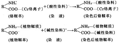 中和使革面阳电荷减弱,在随后的染色、乳液加脂、复鞣中与阴离子型的各种处理剂反应缓和、均匀,可防止上述缺点发生。 由于铬鞣革表面阳电荷强,为使中和反应缓和、均匀,中和剂不宜用强碱,最好选用缓冲容量较大、能平稳释放OH-阴离子的弱碱性物质,或用鞣性很弱的阴离子型合成鞣剂与 (二)染色 湿革的表面电荷不同,要求染料离子所带电荷与湿革表面电荷相反,才能结合上染。铬鞣革用阴离子染料染色,植物鞣革用阳离子染料染色;它们的结合示意如下: