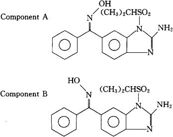 C17H18N4O3S=358.41 CAS-72301-78-1(zinviroxime) CAS-72301-79-2(enviroxime) 韦罗肟是一种A成分Z型静韦罗肟(zinviroxime)和B成分E型恩韦罗肟(enviroxime)的未经分离的合成混合物,其组成比相对恒定为50-50。 An unseparated synthetic mixture of component A(zinviroxime)and component B(enviroxime)in a relatively constant 50-50 ratio. 6-[(羟亚氨基)苯基甲基]-1-[(1-甲基乙基)磺酰]-1H-苯并咪唑-2-胺。 6-[(Hydroxyimino)phenylmethyl]-1-[(1-methylethyl)sulfonyl]-1H-benzimidazol-2-amine. 抗病毒药。 Viroxime,LY 12271-72. INN,USAN.  |