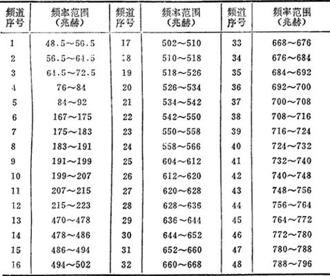例如,规定给各个电视广播通常使用的序号和频率范围,叫电视频道。每个电视频道所占用的频带宽度,各国规定有所不同。我国规定为8兆赫,已划定的各电视频道的频率范围如下表