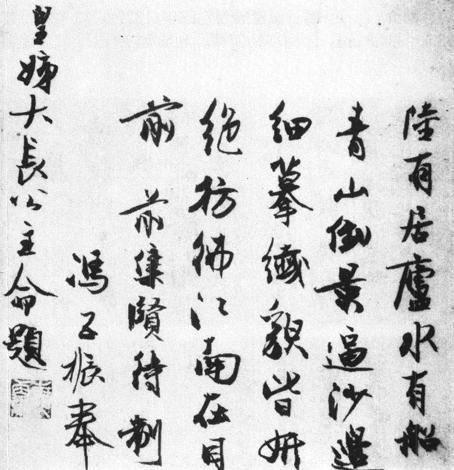 【简介】: 元·冯子振行书。 纸本。凡七行。 每行字数不一。 共四十五字。28×49.3cm。此幅《石渠宝笈》著录、今载《故宫书画录》卷三。 台北故宫博物院藏。刊于台湾《故宫历代法书全集》(十六)。  。【赏析】: 子振史称其“不以书名”,观此作知其于书艺造诣很深,亦爲元代书坛名手。 作者奉皇姊之命于画中题诗,受束甚严,非同平日信札一类自由自在,但写得极爲生动。笔势凌厉、峻迈,意蕴超脱。落笔简捷爽快,行笔疾速,点书间往来有序,顾盼有情。结字于谨严中求变化,因势调整疏密、大小、轻重、俯仰之变,但仍保持上疏下密的结字主调。 如“靑”、“摹”、“皆”、“南”、“奉”、“公”、“命”等字,别具风範。寥寥数行的章法,也处理得弛张有节,使作品挺拔、峭劲,多姿多采,有宋人米芾、山谷遗意。 若干字的鈎、挑及转折之处露出的生硬之笔,是作者尙不能如意地运用硬毫笔所致,爲其小疵。 |