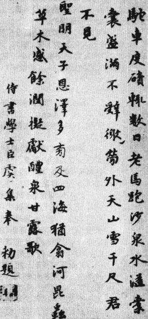 【简介】: 元·虞集书。纸本。行楷。台北故宫博物院藏。刊于《中国美术全集·宋金元书法》。 【赏析】: 虞集的这首题画诗是奉敕而作的。从这首题画诗,我们可以看到他那深厚的书法功力。尽管每个字都写得相当紧凑,但字距和行距都分布得比较疏朗,加上秀润的用墨,足见他的书法是深受二王及初唐影响的。他在处理线条的轻与重、肥与瘦方面,能做到统筹兼顾,不失之偏颇,使人感到他的书作淸新而不淸瘦,丰满而不肥腴;虽作行楷,用笔却相当生动,观之毫无板滞之感。  虞集深得“计白当黑”之妙。除了上述疏朗的布局之外,在“圣明”二字抬头易行之前,几乎空出了一行的空白。这一行空白,差不多将该作品分成了两部分。固然,在封建社会中,文人墨客不得不作另行或空字一类的处理,以表示对天子的顶礼膜拜(虞集还特意将“圣”字写得高出所有字行起首半个字),但这种布局,无疑会使人感到作品的“透气性能”特别好,可见,留白,不仅是应该的,在某些场合,还可收到令人非常满意的艺术效果。 在封建社会中,奉敕赋诗作书是一种荣誉,文采书才究竟如何,都要在皇帝面前亮亮相。在这种场合,不少人的字都写得相当拘谨,发挥不出本来的水平。虞集这首诗,囿于场合,内容平平,在所难免,但从书法形式的角度来看,不仅书写得十分流畅,而且,写顚倒了的“劳”、“徼”二字,他只是用倒置符号一勾了之,并不在意,足见他的爲人。这,大槪可以作爲后来李东阳称讚他“人品高”的一个佐证吧。 |