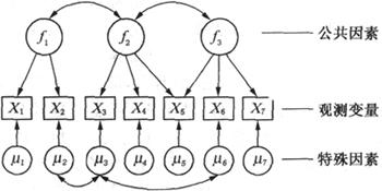 | 释义 | 验证性因素分析 一译“实证性因素分析”。 因素分析的一种。与“探索性因素分析”相对。 强调验证理论分析结果的可靠性。 20世纪60年代以来因素分析的主要进展。研究者首先根据已有的专业知识和实践经验决定:(1)各个观测变量分别受哪些公共因素影响;(2)哪几对公共因素之间是相关的;(3)哪几对特殊因素之间是相关的。下图是研究者根据经验提出的分析模型路径图。 图中的双向箭头表示两者相关。有时研究者会同时提出几种不同的假设模型。 可通过多种方法检验假设模型而作出最后的选择,并估计出未知参数。 其数学模型为X=Af+μ,其中X=(X1,X2,…,Xp)′是标准化观测变量向量,f=(f1,f2,…,fm)′是公共因素向量,满足E(f)=0,A=(aik)p×m是因素负荷矩阵,μ=(μ1,μ2,…,μp)′是特殊因素向量,满足E(μ)=0,m<p。由此可导出观测变量协方差矩阵Cov(X)=∑=AΦA′+ 其最大优点是数学模型的灵活性。模型的灵活性使它能有效地应用于心理和教育研究的许多实际问题。验证性因素模型是结构方程式模型的一种很特殊的子模型。用于分析结构方程式模型的常用软件是LISREL、AMOS和EQS。 利用这些软件可作验证性因素分析。