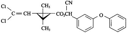 | 释义 | 14.高效氯氰菊酯 中文通用名称:高效氯氰菊酯,英文通用名称:beta-cypermethrin,其他名称:歼灭,化学名称:2,2-二甲基-3-(2,2-二氯乙烯基)环丙烷羧酸-α-氰基-(3-苯氧基)-苄酯;本品为1R-顺式酸-S-醇/1S-顺式酸-R-醇(1∶1)和1R-反式酸-S-醇/1S-反式酸-R-醇(1∶1)的混合物,顺反式比例约2∶3,化学分子式:C22H19Cl2NO3,相对分子量:416.3。 化学结构式: