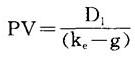 式中的D1为第一期的红利支付总额,ke为投资者所要求的收益率。 如果用D1表示每股股票的红利支付,那么PV就是每股股票的市场价格。高登增长模型就可以写成: