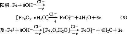 从电解液转移到阳级表面 阴极:2H2O→H22OH↑(--2e (8) 总反应式是: Fe+2OH-+2H2O→FeO2-+3H2(9) 及: 高铁酸根形成后很容易被阴极或阴极H↓(2还原,反应如下: